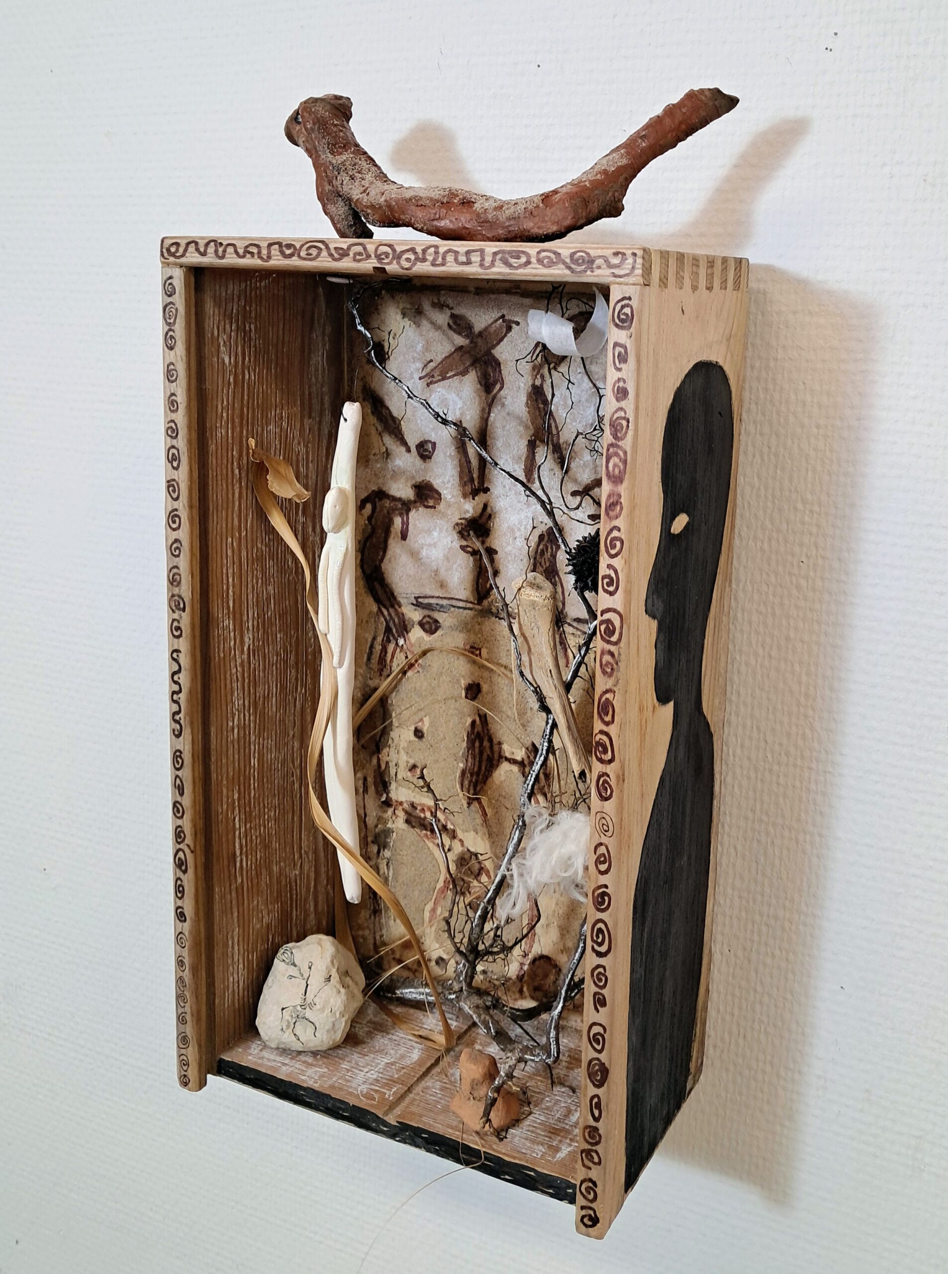 Verder maakt zij op dezelfde manier objecten van gemengde materialen: klei, touw, leer etcetera, en op straat en in de natuur gevonden spullen.
