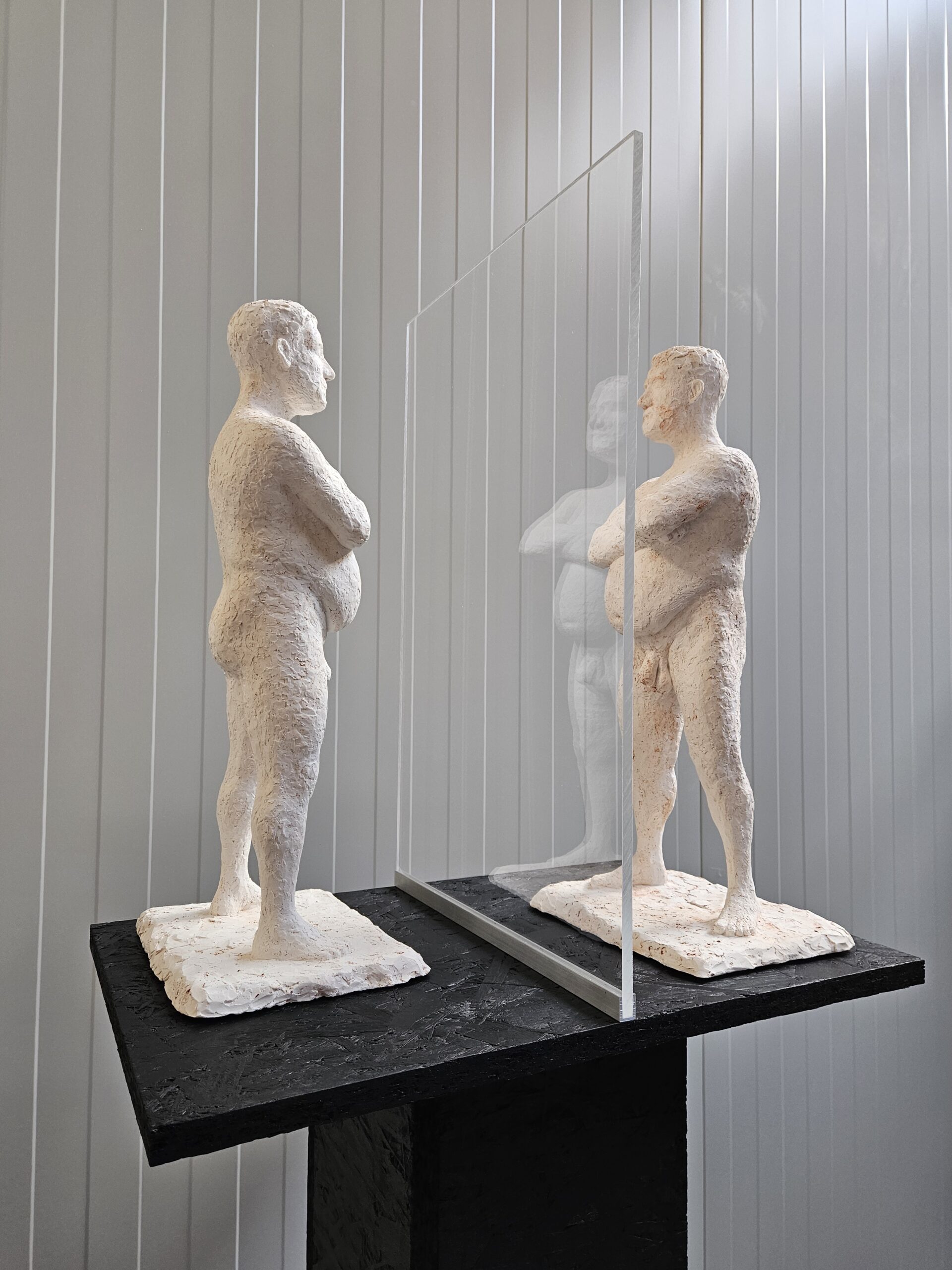 That's why I've placed two identical naked male figures opposite each other. They look at each other from a specific angle. The intention is for it to be seen as one person, trying to achieve something for themselves. Although the man's posture is defensive, he nevertheless makes himself vulnerable (naked). However, external influences (the digital world, family, friends, environment, etc.) hinder self-reflection. This is represented by the presence of a sheet of plexiglass. The self-reflection therefore applies not only to the man, but also to the woman.